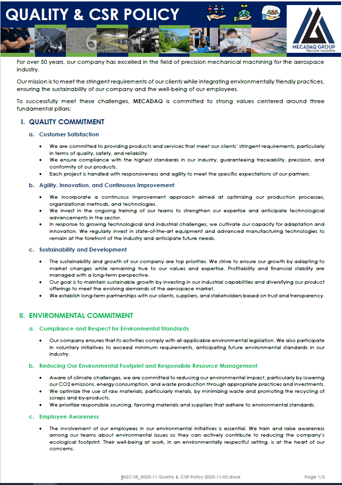 Mecadaq is committed to a strict quality management policy, meeting the excellence requirements of the international standard specific to the aeronautics industry, EN9100, and very soon ISO14001.